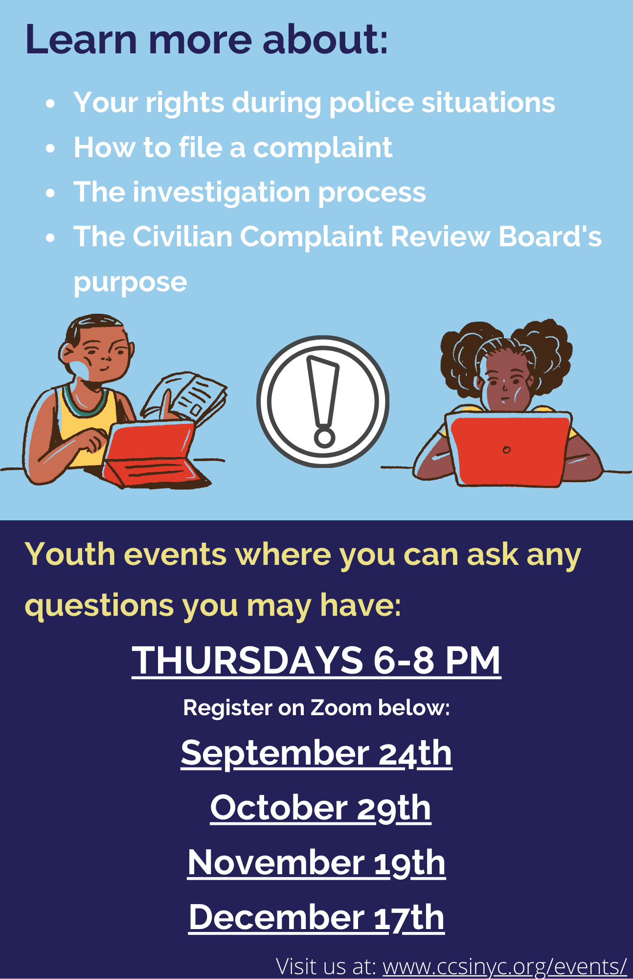 Download the flyer here: Know Your Rights Flyer CCSI YAC CCRB Fall 2020_FINAL